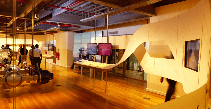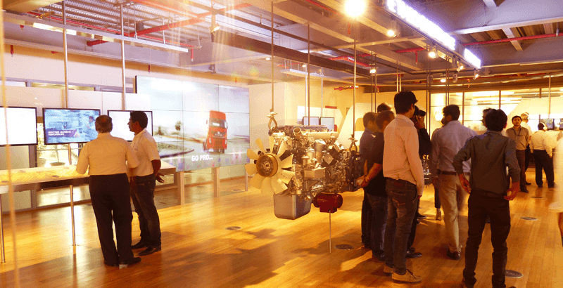 The Volvo Eicher Experience Center features interactive exhibits, including a touch table that guides visitors through the journey from design to delivery.
