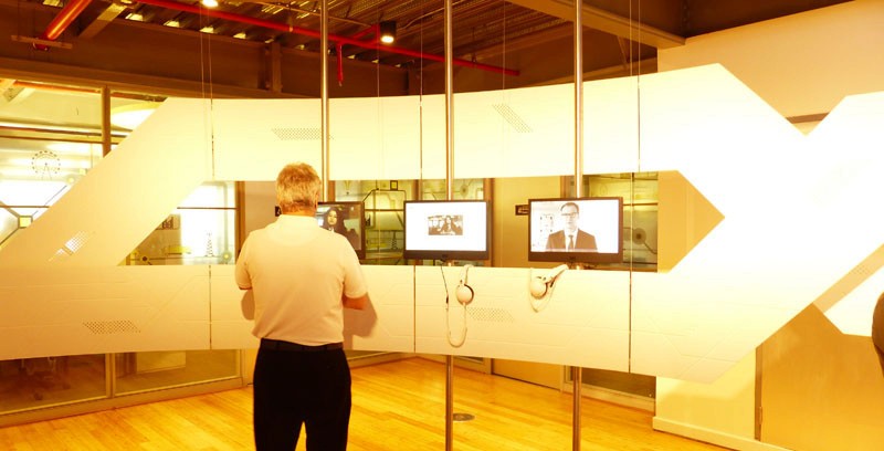 A video wall, controlled by a small touchscreen, plays on-demand videos of flagship products.